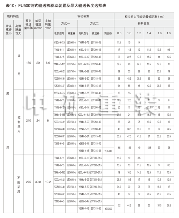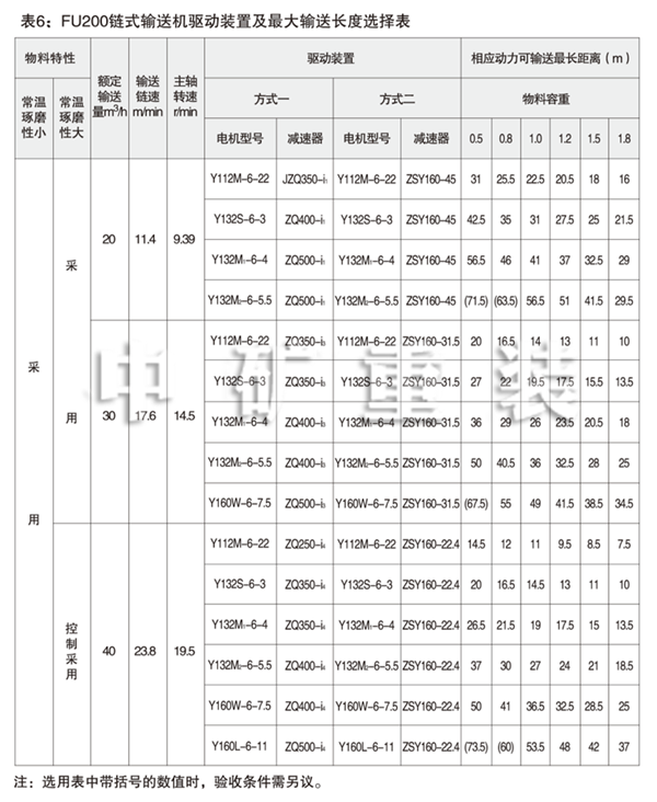 表5: FU150鏈?zhǔn)捷斔蜋C(jī)驅(qū)動裝置及輸送長度選擇表 Table 5: FU150 Chain Conveyor Drives and Max Conveying Distances